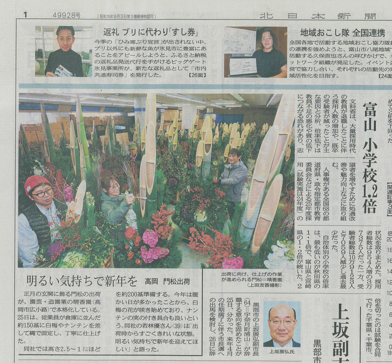 門松出荷最盛期を迎えまして、たくさんのマスコミの皆さんに取材を頂きました。今年は初めて北日本新聞様が一面に記事を掲載くださいました。大変な作業ですが、若いスタッフが楽しそうに門松を作ってくれている姿がとても頼もしくまた、大変うれしい光景です。